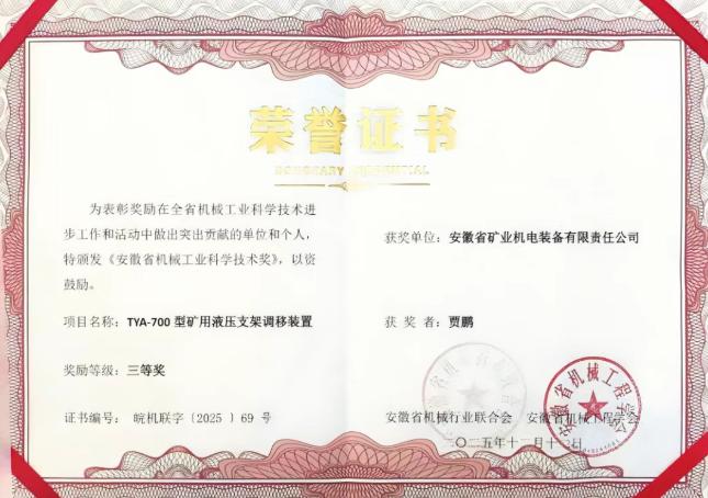 2025年度安徽省機械工業科學技術獎獲獎名單日前正式公布。安徽礦機自主研發的“TYA-700型礦用液壓支架調移裝置”成功斬獲三等獎!
