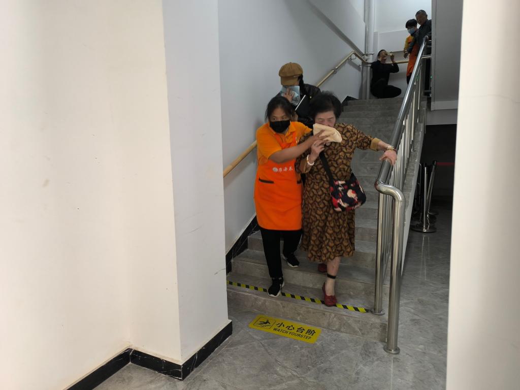 演練隨著急促的警報聲拉開了序幕,參與人員按照既定分工、迅速集合、分組行動,養老護理員陪同老年人捂住口鼻、低頭彎腰,按照疏散路線快速有序撤離。整個演練過程,全體人員密切配合,救援迅速及時,現場井然有序,取得圓滿成功。
