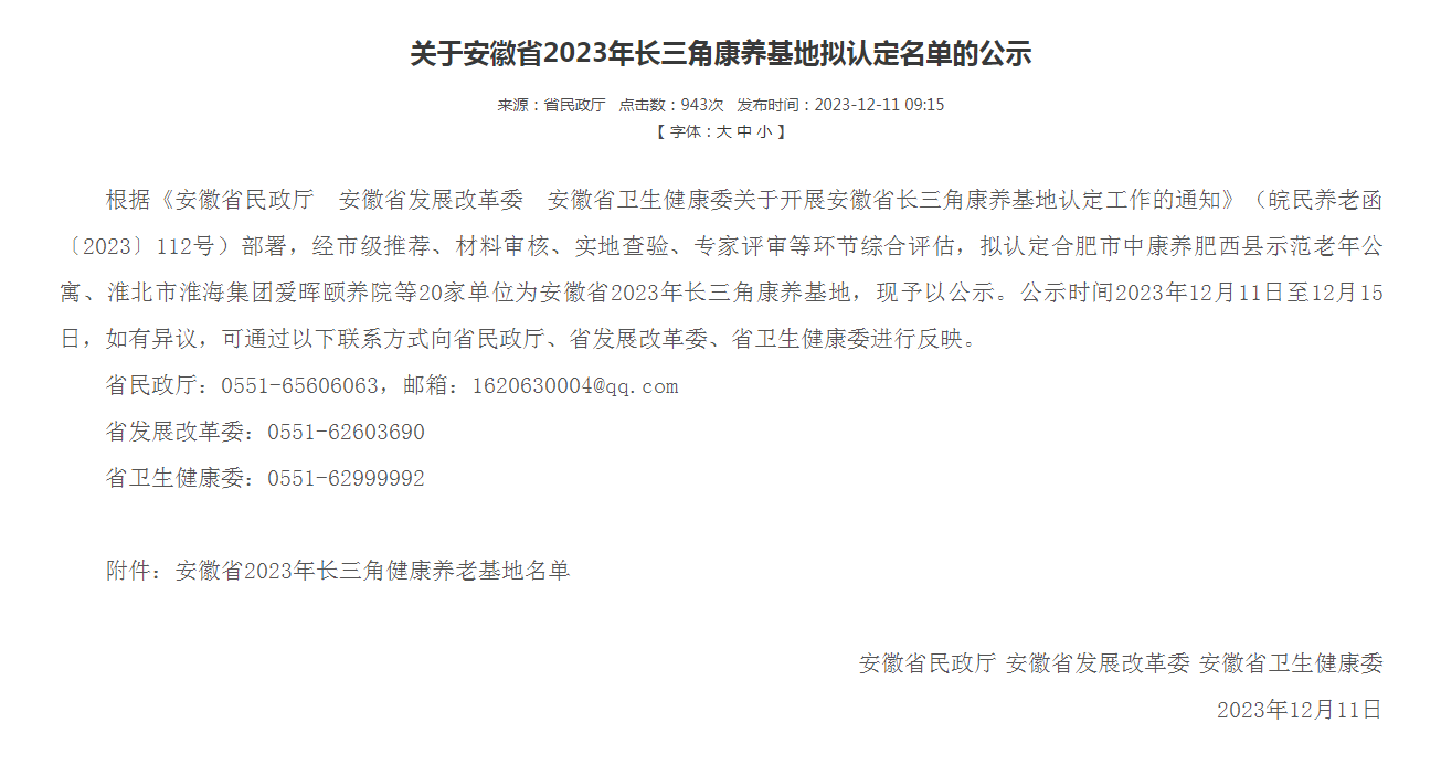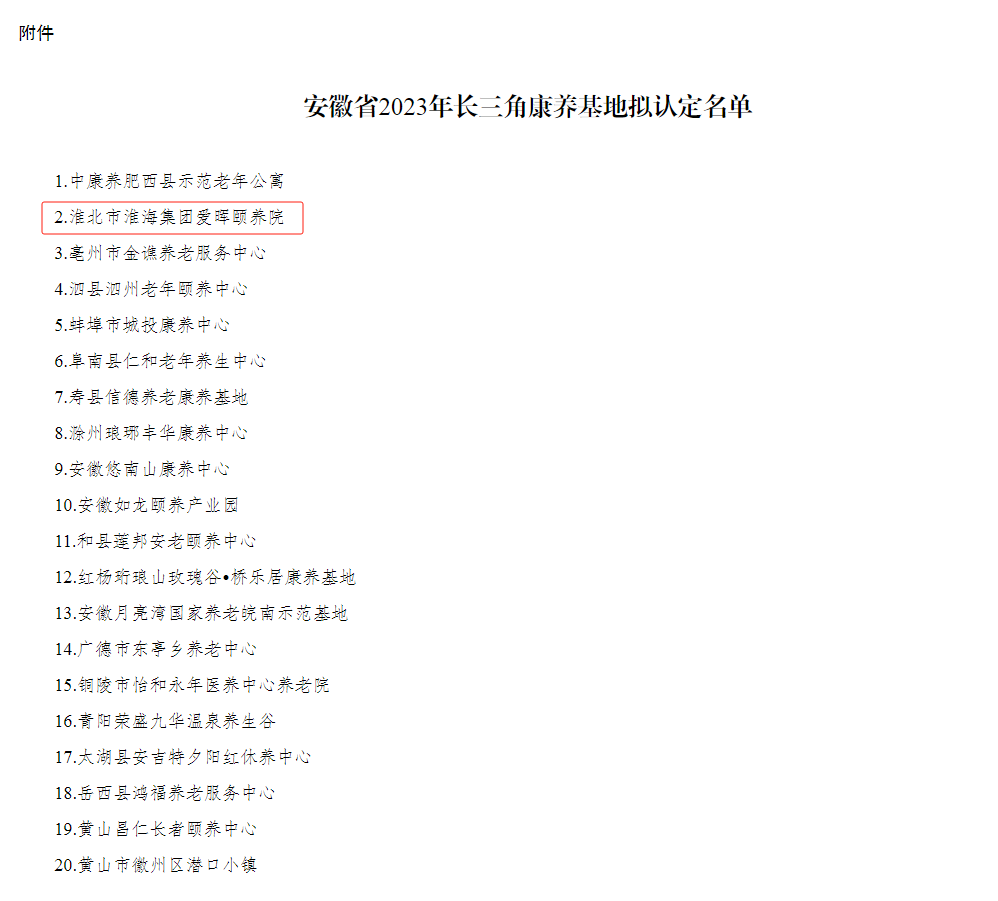 近日,相王現(xiàn)代所屬愛暉頤養(yǎng)院成功被安徽省民政廳認(rèn)定為“2023年長(zhǎng)三角康養(yǎng)基地”。