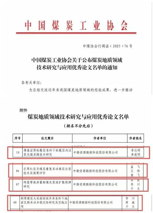 據(jù)了解,該公司始終堅持“科技興企”,持續(xù)加大科研投入,4項獲獎成果均源自一線工程實踐與重點科研項目,直指煤炭綠色開采與安全生產(chǎn)中的關(guān)鍵技術(shù)難題。研究成果不僅為行業(yè)提供了新技術(shù)路徑,也進一步鞏固了中勘科技在“三下”壓煤開采、固廢協(xié)同處置等細(xì)分領(lǐng)域的領(lǐng)先地位。