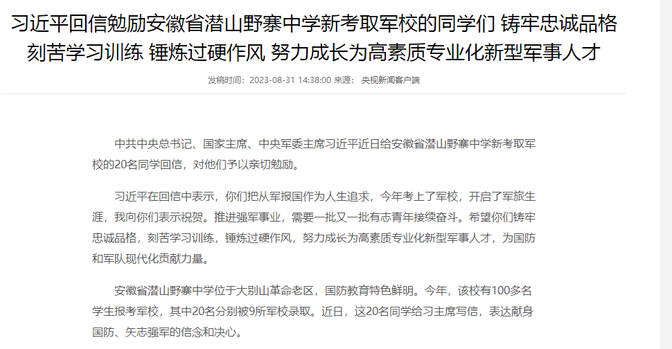 習(xí)近平回信勉勵安徽省潛山野寨中學(xué)新考取軍校的同學(xué)們 鑄牢忠誠品格 刻苦學(xué)習(xí)訓(xùn)練 錘煉過硬作風(fēng) 努力成長為高素質(zhì)專業(yè)化新型軍事人才