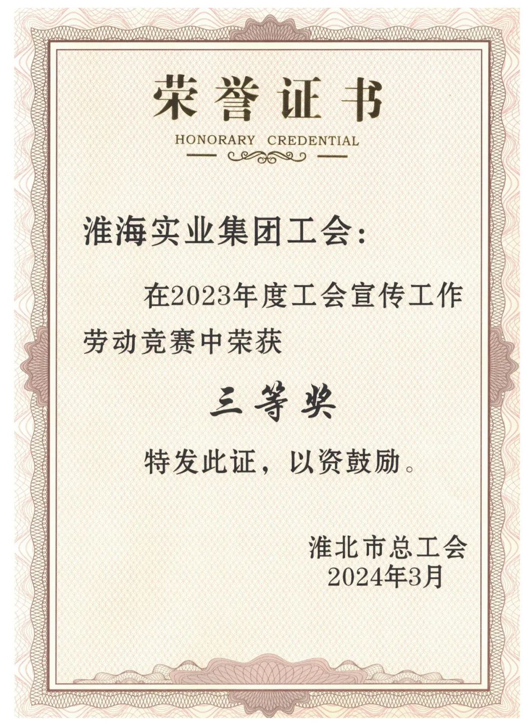 3月12日,筆者了解到,淮海實業集團工會榮獲淮北市2023年度“五型工會”勞動競賽一等獎、全市工會宣傳工作勞動競賽三等獎。《匯聚創新合力賦能高質量發展--淮海實業集團勞模(工匠、職工)創新工作室和技能大師工作室創建調研與思考》《凝聚“她”力量 巾幗譜華章--淮海實業集團女職工工作情況調研報告》兩篇調研報告分獲全市工會優秀論文和調研報告一、二等獎。