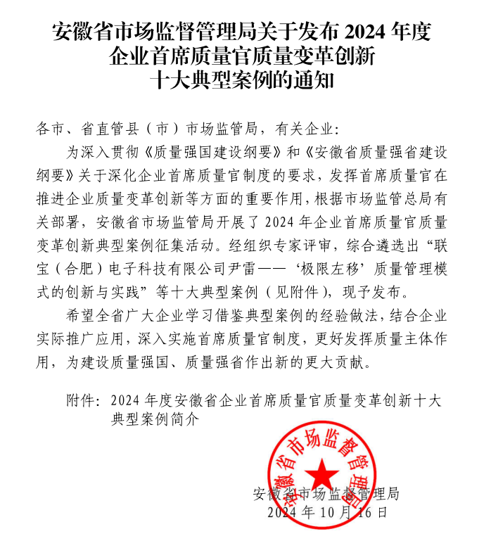 近日,安徽省市場監(jiān)督管理局發(fā)布“2024年度企業(yè)首席質量官質量變革創(chuàng)新”十大典型案例,淮海實業(yè)集團《“四層級”全員質量管理模式》成功入選。